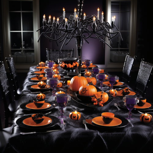halloween table settings orange purple black green with scary themed food deserts and spider webs in a black room with silver chandelier
