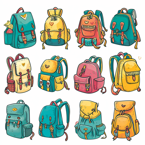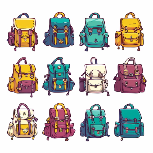 collection of backpacks cartoon style assets,simple shapes,desaturated colors ,isolate on white background --style raw --no photo-realistic, lights, shadows, textures, outline --v 6.0
