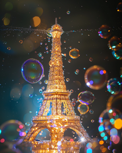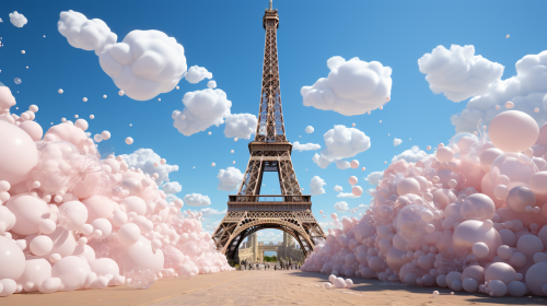 Cartoon-style illustration of the Eiffel Tower in Paris, with white clouds in the sky. Vector art, colorful cartoon illustration, flat colors, 2D game graphics, cartoon background, high resolution, no shadows on the character's body, full color.