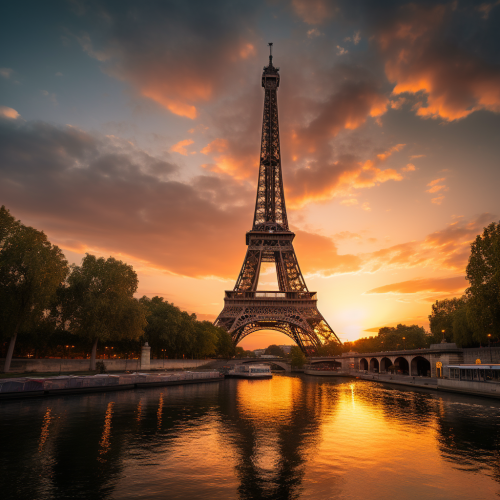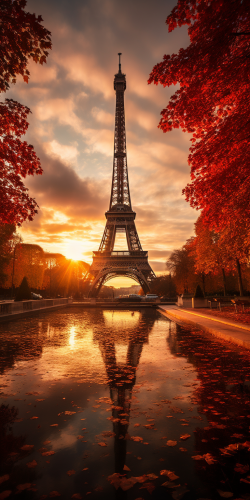 beautiful sunset landscape photo of the Eiffel Tower in autumn --ar 1:2