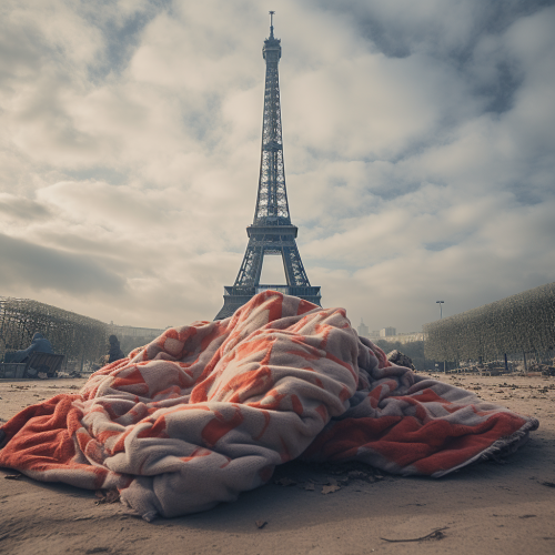 Concept image of an iconic olympic swimming pool with diving blocks, red and white lane ropes and red and white striped sun loungers with parasols. located beneath the Eiffel Tower. Fujifilm, --style raw --ar 1:1