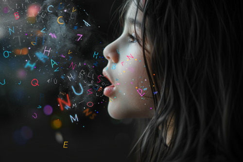 pictures for speech therapy site girl with letters coming out of her mouth side view cinematic quality --ar 3:2 --s 250