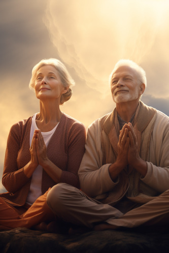 Elderly couple meditating. and Mindfulness and good mental health to reach health and higher dimensions. Geographic Photo, warm and vibrant colours, insanely realistic and detailed, hyper realistic, ultra realistic photo scenery --ar 2:3