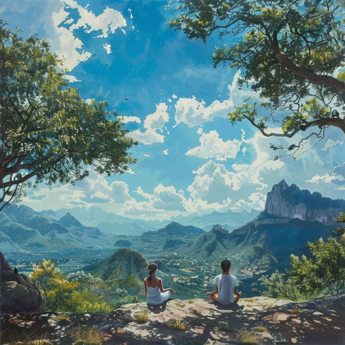Realistic photo. Landscape of Tepoztlán, a man and a woman in the center, meditating under a completely blue sky.