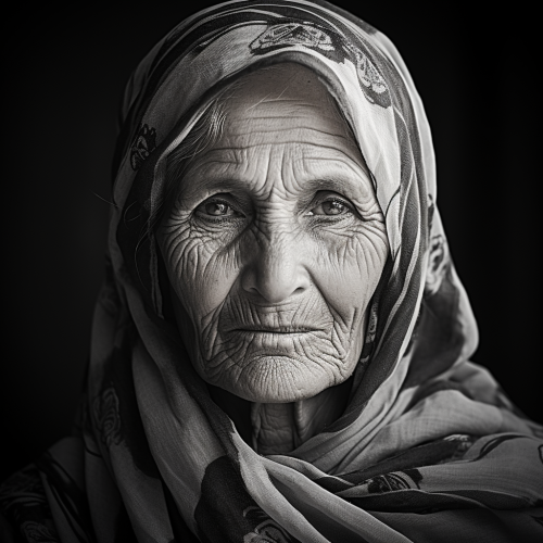 A picture of an Egyptian woman from Upper Egypt in her eighties who is a grandmother. The picture is black and white old style photography with a Nikon camera with a foggy background