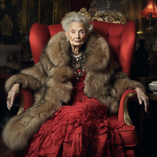an hod couture grandma, christmas, wearing a balenciaga faux fur dress, festive, raw, realistic, photography