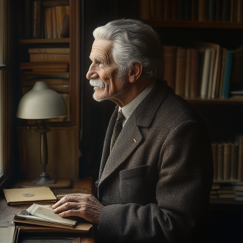 . Albert Schweitzer, an elderly man with a wise and gentle expression, wearing early 20th-century academic attire, standing in a small, dimly lit study surrounded by books, his hand resting on a desk as he looks out of the window thoughtfully, an old wooden desk and a lamp in the background, medium close-up shot, hyper-realistic, photo-realism, cinematography.