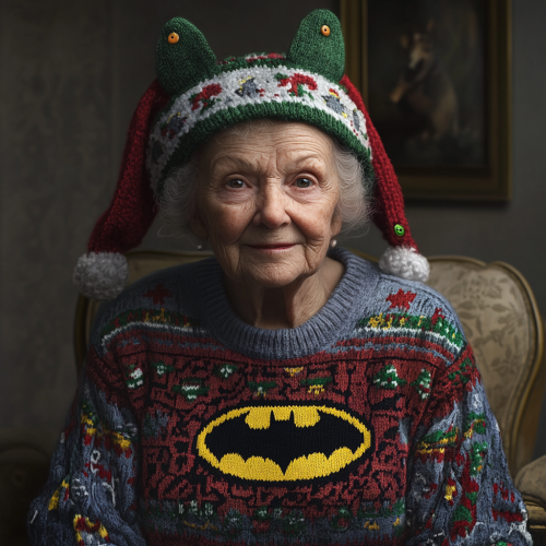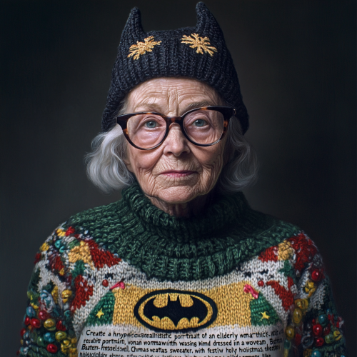 "Create a hyper-realistic portrait of an elderly woman with a beautiful, kind face, wearing thick, hipster-style tortoiseshell glasses. She’s dressed in a woven Batman sweater transformed into an ugly Christmas sweater, with festive holiday elements like snowflakes, reindeer, and garlands humorously mixed with the Batman logo. On her head, she wears a knitted hat with Batman's iconic ears, adding a quirky charm. Capture intricate facial details, showing warmth and character, with rich textures in the sweater, hat, and glasses. The setting is cozy, with soft lighting, emphasizing the contrast between her elegant expression and the playful, unique outfit."