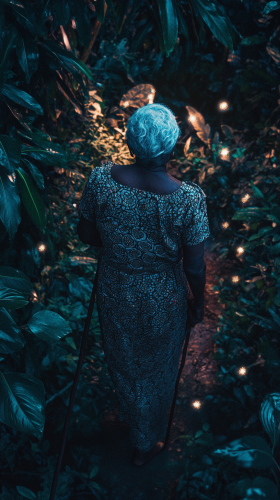 generate a hyper realistic full picture of nkechi ,woman, Nigerian, 75 years old, bent and holding a walking stick, standing in a small clearing at night, inside a village thick forest, her back to the camera view from above, 8k, --v 6.1 --ar 9:16