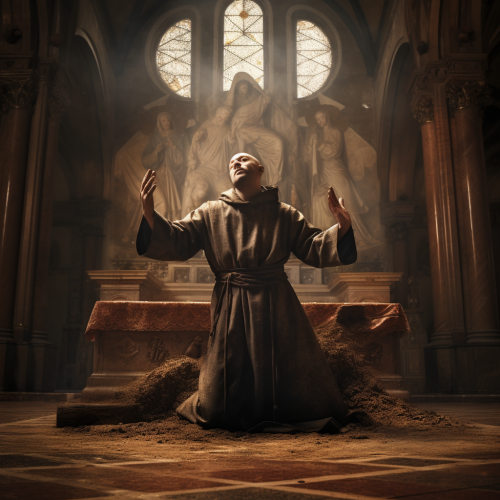 Job in prayer, head lowered and hands clasped in front of a large altar with smoldering sacrificial flames, seeking purification for his children. His expression is somber, with rays of morning light breaking through clouds, illuminating him softly. The surrounding area is sparse, reflecting humility and devotion. Photorealistic, atmospheric lighting, symbolic composition, textured surfaces, 9:16 --v 6.0