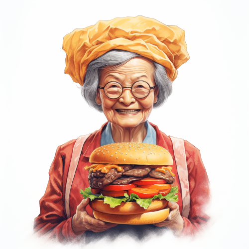 Elderly Japanese woman with a large hamburger head. Smile fullbody