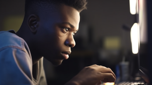 Elearning platform, student with computer, captured with a Sony α7 III camera, equipped with an 85mm lens at F 1.2 aperture setting cinematic shot. The image, shot in high resolution and 16:9 aspect ratio, stunning realism dramatic light, film grain, Leica 50mm, 8k 3d hyper-realistic micro details cinematic elegance epic symmetrical detailed Caravaggio-style lighting, UHD, high details, high quality --ar 16:9 --v 6.0