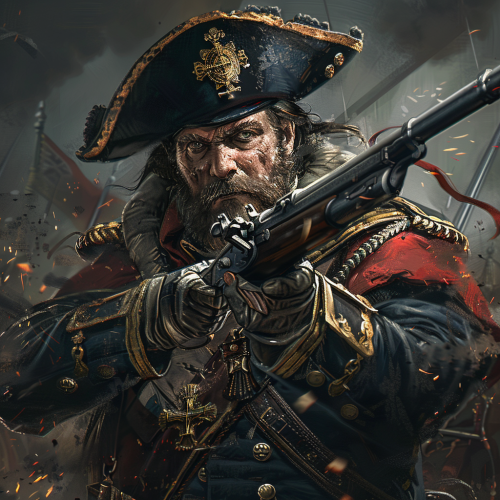 a giff wielding a musket wearing napoleonic chainmail and an admiral's hat