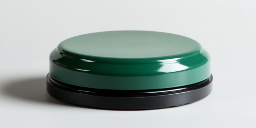 "Industrial round button with a slightly opaque green top, completely flat without any convexity, placed on a black opaque plastic base, glowing green, rotated 45 degrees to the left, facing slightly towards the viewer, white background, no shadows --ar 2:1 --s 250 --style raw