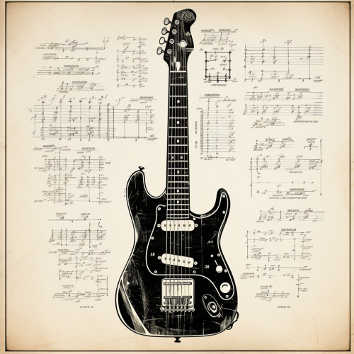 a blueprint patent layout diagram of an electric guitar, vintage retro, black and white