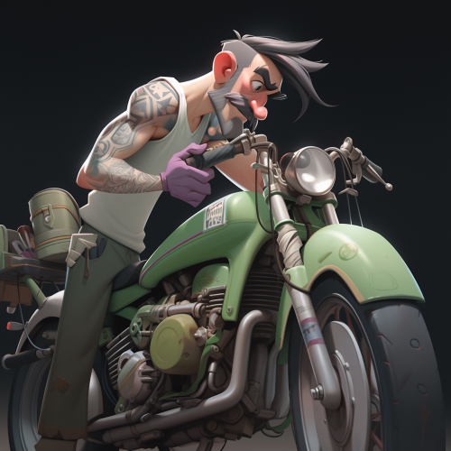 electric bike mecanic technician with moustache and tattoos working in his green electric bike workshop fixing an electric bikes. the visual must be realistic visual in 3d animation a full render and vibrant colors. --s 270 --niji 5