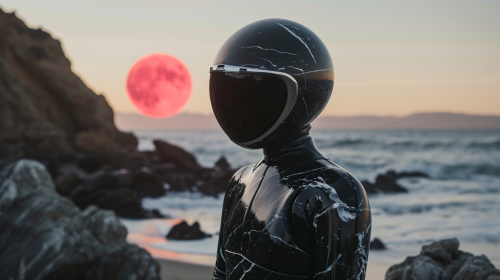 Wide-angle shot of an elegant black marble armored sci-fi astronaut power ranger on the beach. Her helmet reflects the bright red moon. Ethereal light, 70s polaroid film photography, Wes Anderson, Maxfield Parrish, Klimt, Kusama --chaos 7 --ar 16:9 --v 6.0