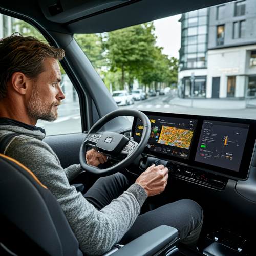 Answer The driver is seated in the driver's seat of the electric vehicle, intently looking at the control screen. The screen prominently displays that the vehicle's battery is at 100%, with a driving range of 120 kilometers. The composition emphasizes the control screen, which occupies two-thirds of the overall frame, highlighting the important information and technology available to the driver. This focus on the screen underscores the modern features of the electric vehicle and the driver's readiness for an upcoming journey.