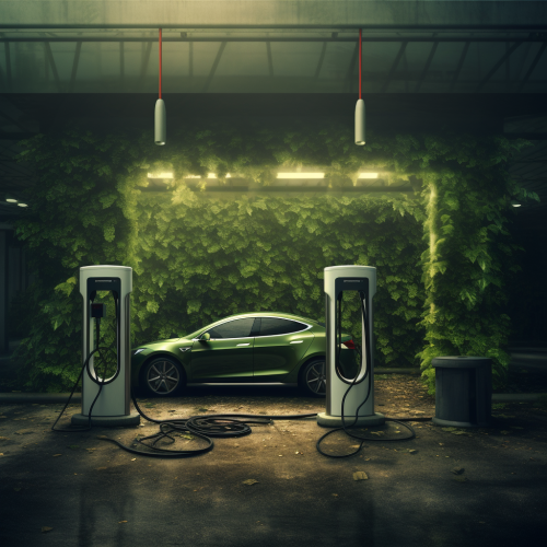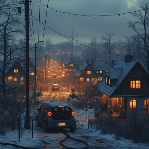create an image that has several houses completely dark with the exception of one, which has lights on inside. that house is connected to an electric vehicle. It is dark outside. --s 750 --v 6.0