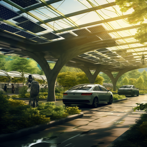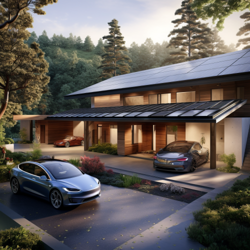 show a picture of a house with solar panels that has a number of electric cars charging in the driveway. Make the photo hyper realistic.