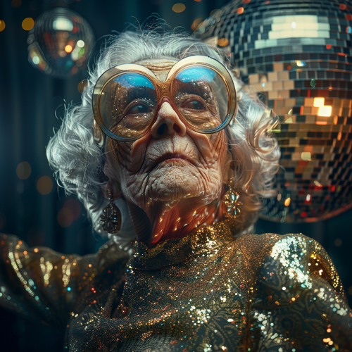 electronic music, disco ball and this old woman in bright tones futuristic shaped glasses is wearing heels, in the style of ebru sidar, leo putz, elke vogelsang, agfa clack, futuristic, portrait, zany, neon tones, electronic music party, --v 6.0 --s 250
