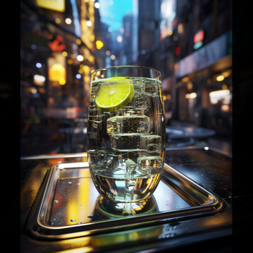 a futuristic metallic glass of a gin lemon in a cyberpunk green enviroment, in a urban neon atmosphere.