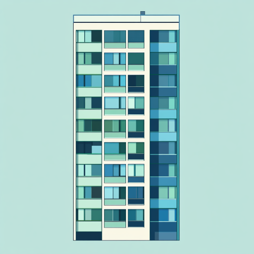 Flat design style image representing the management of a residential building. The drawing should follow the color palette of shades of blue and green