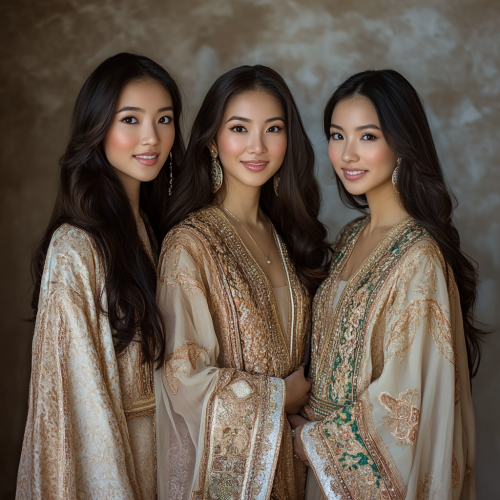 "Three elegant Asian, professional women standing together. They are dressed in luxurious, understated uniform in natural tones, blending into a sophisticated, refined atmosphere. Each woman is smiling warmly, exuding grace and professionalism. and tasteful accessories. The background suggests a formal wall, ambient lighting, creating a welcoming atmosphere.