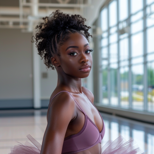 Afro futuristic ballerina posing with beautiful dark skin, body facing the camera, heald tilted looking off to the side. She is wearing a mauve futurtistic tutu. Background is set in a ballet class.