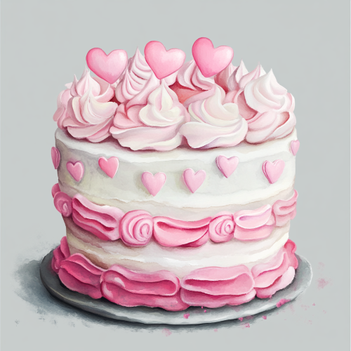 highly detailed clipart of a watercolor valentine cake in white and pale pink pastels and colors and their shades, beautifully decorated with sugar hearts, a touch of pink sugar, soft colors, beautiful illustration with realistic details, high resolution, gray background