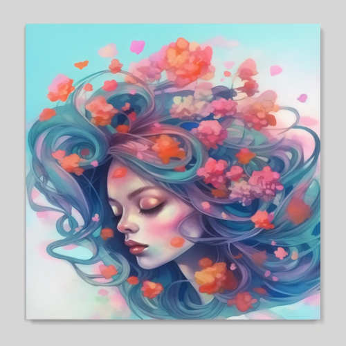 a girl with flowers on her floating hair, style of soft pastels, colorful, sparkling, abstract, illustration --v 5.1