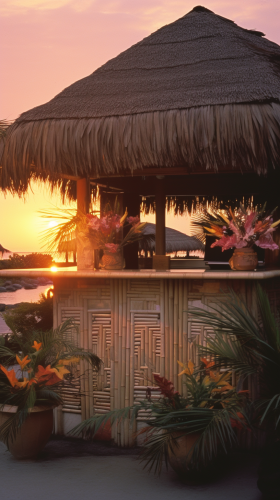 an old photograph of a highly stylized 1980s beach house outdoor tiki bar, sunset, in the style of old money interiors, 1980s tacky: :3, grainy photography: :6, --ar 9:16 --c 2 --w 10 --style raw