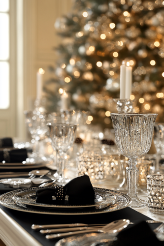 A central corridor runs through the room, with circular, high-end black tables placed along its sides. The tables are set with silver cutlery. The room is red.