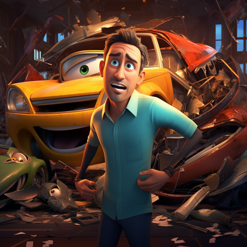 ashamed 45 year old man checks damage of car wreck. pixar style. digital art. colorful and eye catching.