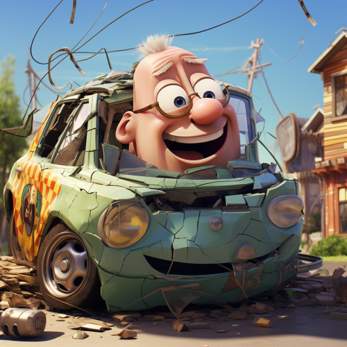 45 year old man checks damage of car wreck. pixar style. digital art. colorful and eye catching.