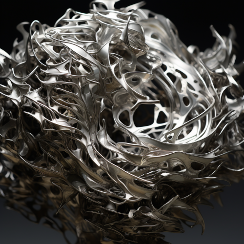 Design an abstract artwork that embodies modern elegance and sophistication. The piece should feature a blend of sleek lines, graceful curves, and dynamic shapes, with a color palette that combines muted tones and rich accents. Integrate subtle metallic elements or textures to enhance the visual depth and refinement. The composition should be bold yet harmonious, offering a unique and memorable aesthetic that stands out in the world of abstract art. Aim for a design that captures a sense of luxury and innovation, ensuring the piece is both eye-catching and elegantly understated --ar 4:5