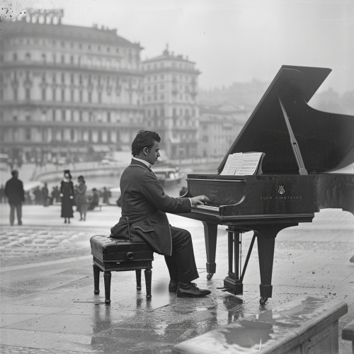 Piazza San Pietro in Trieste in 1913.. An elegant blond young man, with a typical 1913 hat, plays a piano, alone in the square black and white image with some light blue colours