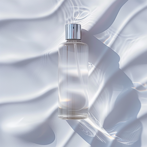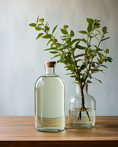 A minimalist composition of a simple, elegant glass bottle lying on a clean, white surface, with the soft natural light creating a serene atmosphere, tea --ar 4:5 --s 700