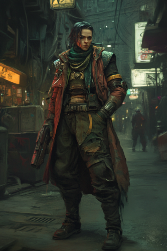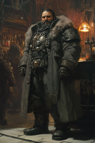 a full body shot of a male warhammer 40k hive ganger. She wears a scruffy grimdark street clothes. In the background is a gothic grimdark bar. digital painting --ar 2:3 --v 6.1