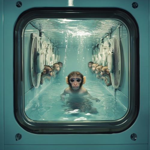 baby monkey submerged in water inside a water incubator tank. monkey appears to be floating in the midle of the tank with eyes clothes. there is a whole row on both sides of baby monkeys submerged inside a cryo chamber cylinder tank.