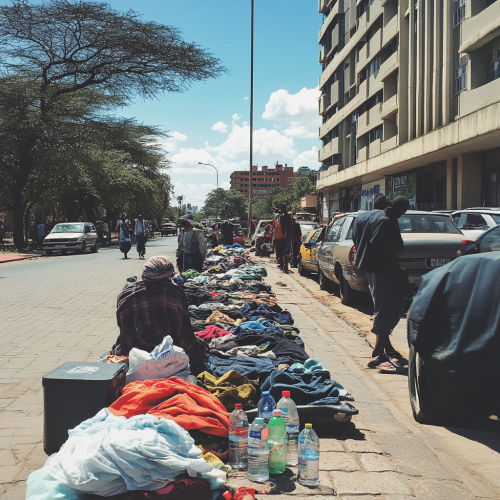 a realistic photo from harare where people are selling clothes in the middle of the street. Add some water bottles and old toyota cars. Make the people happy.