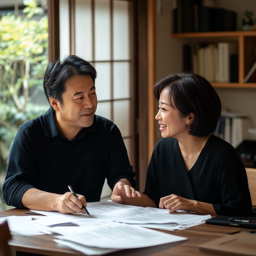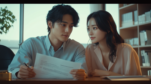 Realistic photo of a 30-year-old Japanese couple sitting together at a desk, both engaged in a friendly and open discussion about a loan, with the husband attentively reviewing documents while the wife listens with a gentle smile, exuding a supportive and positive atmosphere. Photorealistic, realistic image, 16:9 aspect ratio, 8K resolution --v 6.1 --style raw