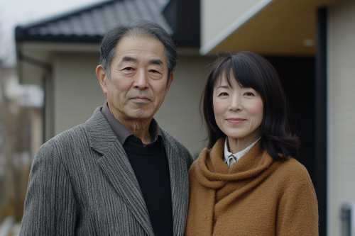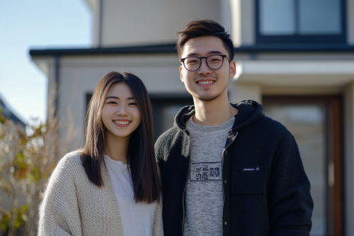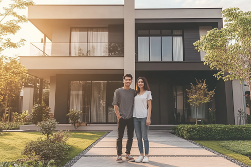 Realistic photo of a young Japanese couple posing in front of their newly built home, both smiling happily, casual attire, the clean and modern exterior of the house clearly visible, representing a new chapter in life. Photorealistic, realistic image, 8K resolution --ar 3:2 --v 6.1 --style raw