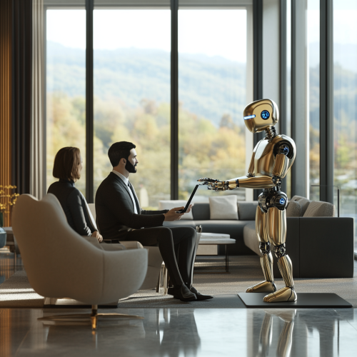 "A sleek, semi-human AI call bot is consulting with a couple in an elegant real estate office. The bot, with a metallic yet human-like appearance, is explaining property details on a tablet or display. The couple is fully engaged, listening carefully, with expressions of interest. The setting is luxurious, featuring modern, high-end furniture, large windows, and tasteful decor, exuding an atmosphere of wealth and exclusivity. The AI bot, acting as a real estate consultant, professionally interacts with the couple in this high-tech, sophisticated environment., ar--16:9