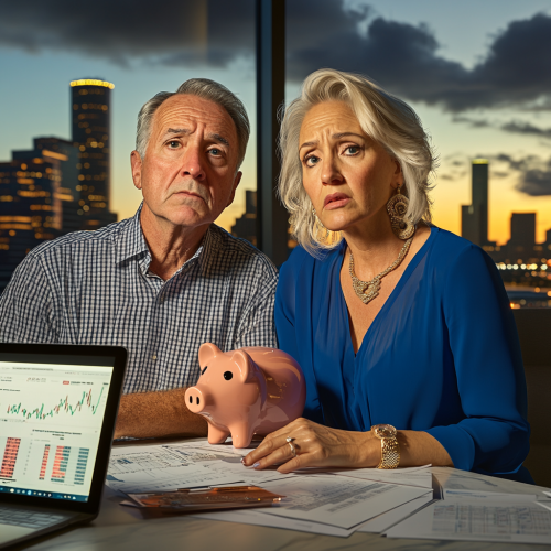 A sophisticated couple in their 50s, dressed in upscale casual attire, looking directly at the camera with concerned expressions. They're sitting in a luxurious home office with a large window overlooking the Houston skyline at sunset. On the desk are scattered financial documents, a laptop showing stock market graphs, and a piggy bank with cracks. The lighting is warm but dramatic, emphasizing the worry on their faces. Hyper-realistic style, high-quality photograph, 4K resolution.