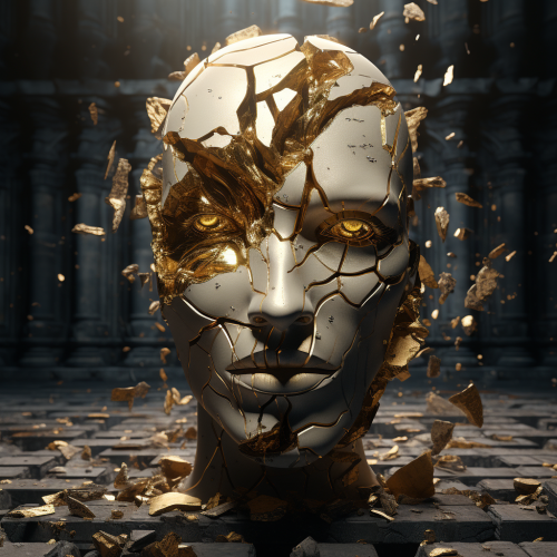 Cracked mask on skeleton. Gold pouring from cracks. Elegant. Liquid gold. 8k ultra. v6