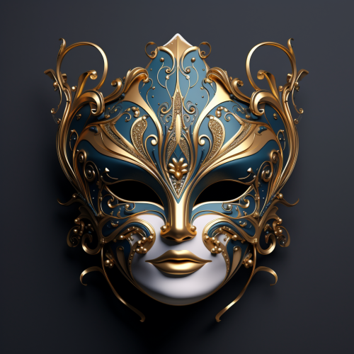 Design an elegant background for the Carnival-themed event with gold masquerade mask elements on blue textured paper, creating a luxurious and sophisticated atmosphere. The design should include delicate swirls of golden filigree patterns around the edges to complement the overall theme. Ensure that there is ample space in front or at the top for branding or promotional text. This backdrop will add elegance withoutclutteringthe main stage area. No mockup effect! --ar 3:2