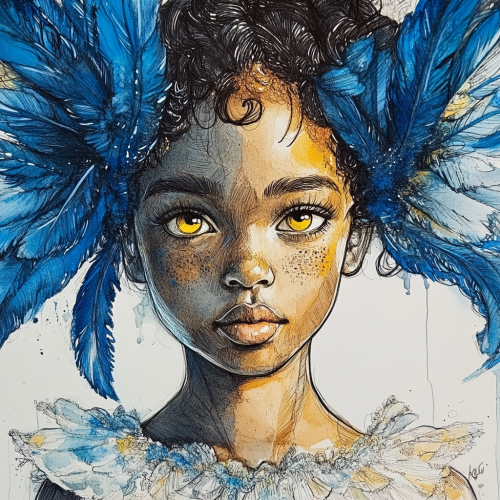 pen and ink drawing colored in with watercolors of a young southern belle with dark skin, bright yellow eyes, blue feathers instead of hair, and blue feathered wings instead of arms