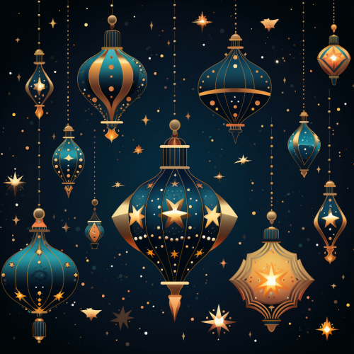 decorative arab lanterns and stars illustration. geometric vector style. bright colors on a dark blue background.