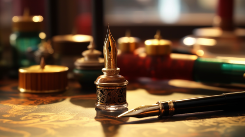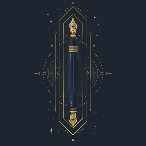 vector graphic of a fancy dark blue fountain pen, simple shapes, old fashioned, gold accents